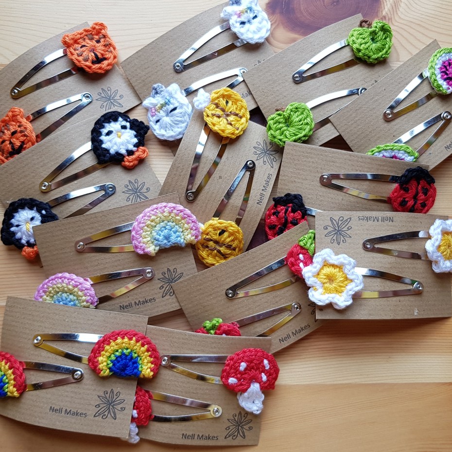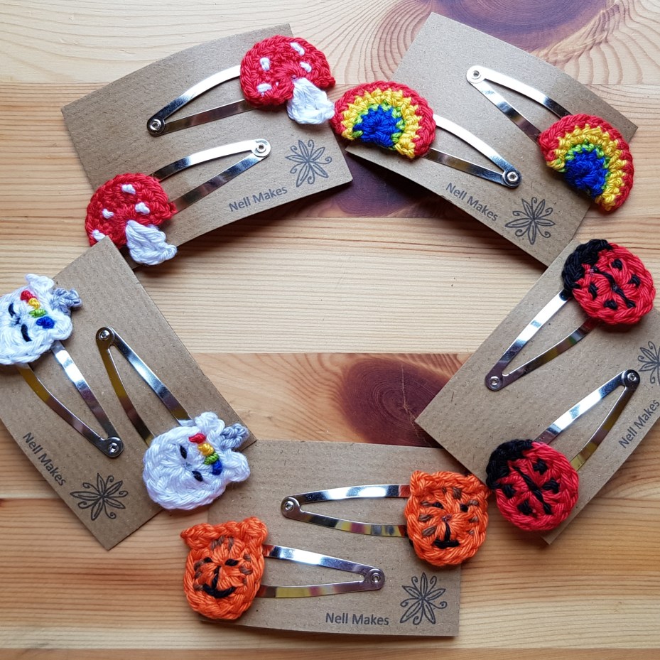 I make a variety of hair accessories including ties/elastics, grips and clips. Please take a look at the images below. Hair accessories are available to buy in my etsy shop or if you don’t see quite what you are looking for please send me a message at hello@nellmakes.co.uk or through my facebook page and I will be very happy to discuss a custom make.